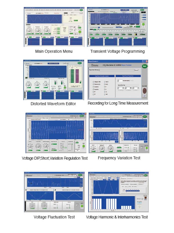 Chroma 61501可编程交流电源提供图形化接口的控制软件, 提供简易设定及操作, 可执行所有的功能. 并内建测试法规. 并可以长时间记录量测值, 存成档案供分析。