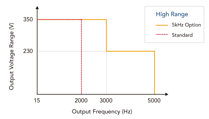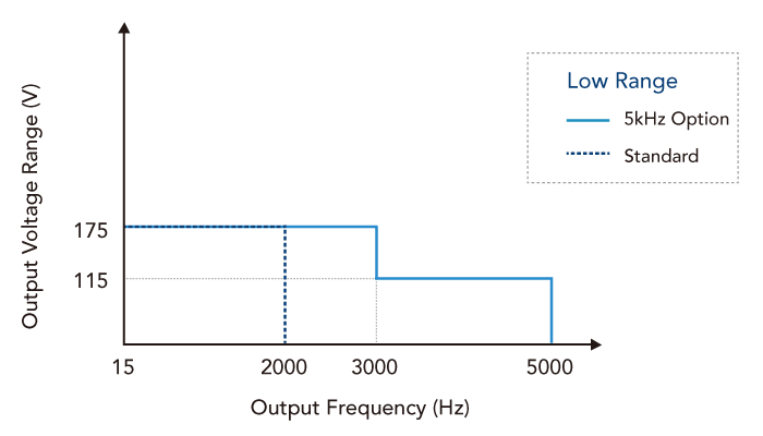 Chroma 61507/61508/61509可藉由选购配件提供5kHz高频率输出功能。而搭载此选购配件后,交流源机台会有不同的High / Low档位输出电压范围,其细节如下图所示。