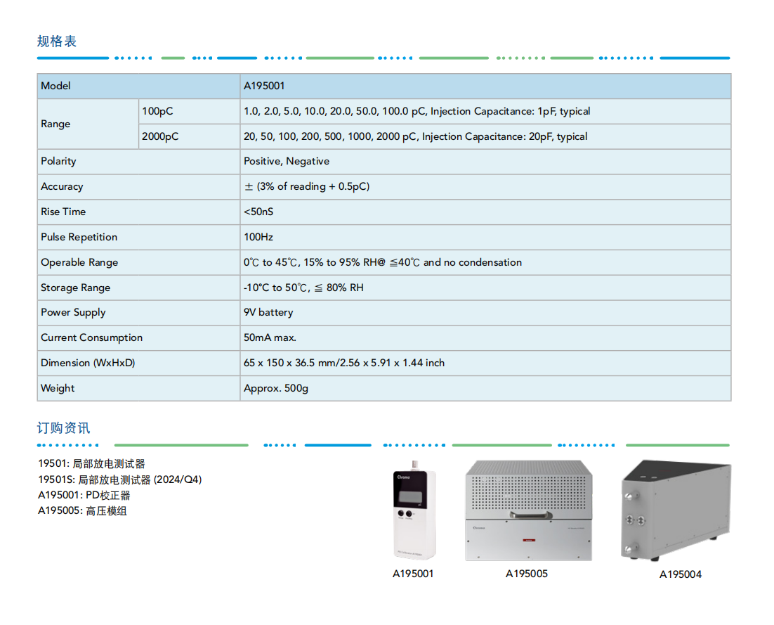 Chroma 19501局部放电测试器可提供交流耐电压测试(Hipot Test)测量待测物上的漏电(Leakage Current)与电气闪络(Flashover),以及提供局部放电(Partial Discharge,PD)测量待测物上局部放电的电荷量(pC)对高压元件与高耐压的绝缘材料进行交流耐电压与局部放电测试,可确保产品的绝缘品质与提升产品的可靠度。